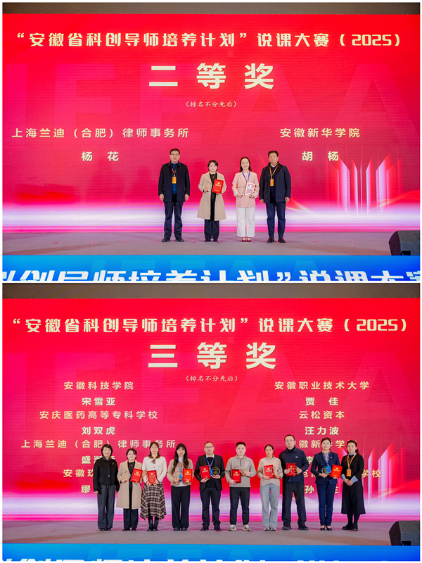 本网讯(通讯员:陈启虞 胡杨)12月20日,2025年安徽省科创导师培养计划说课大赛在合肥融创永乐半山酒店圆满结束。威尼斯官网两位参赛教师凭借优异表现荣获佳绩——文化与传媒学院教师胡杨获二等奖,艺术学院副教授李薇薇获三等奖,展现了威尼斯官网在创新创业教育领域扎实的师资力量与教学水平。
