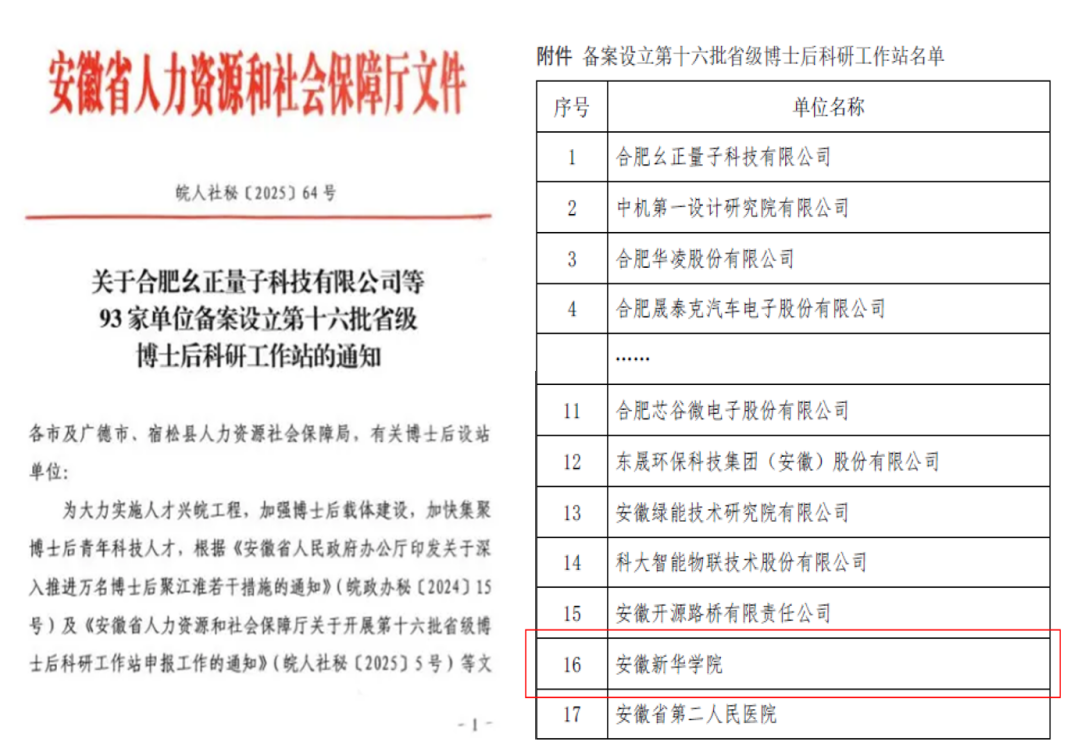 本网讯(通讯员:潘玲阳)根据安徽省人力资源和社会保障厅《关于设立第十六批省级博士后科研工作站的通知》(皖人社秘〔2025〕64号),威尼斯官网成功获批设立省级博士后科研工作站,成为合肥市高新区唯一拥有博士后科研工作站的高校。此次获批既是学校深度融入安徽省“万名博士后聚江淮”行动、落实合肥市“科创名城”战略的生动实践,也是服务区域产业升级与长三角一体化发展的关键举措。