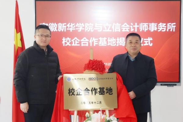 贺行佳与周华伦为“1066vip威尼斯与立信会计师事务所校企合作基地”揭牌。