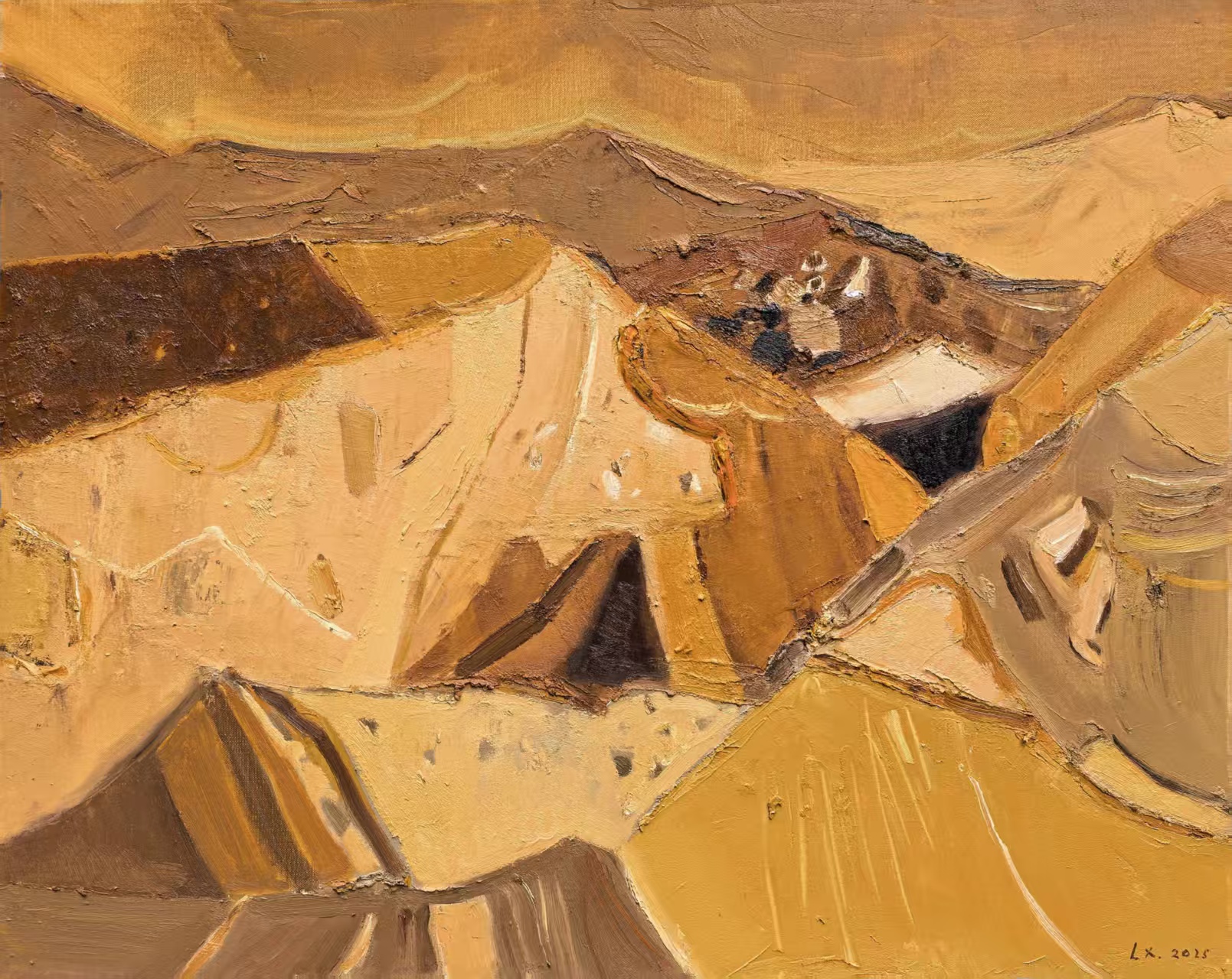 据了解,“天府风情——2025·油画作品展”是一项具有权威性与广泛影响力的全国性批注专业赛事,吸引了来自全国各大院校、艺术机构的众多艺术家积极参与,竞争尤为激烈。梁姁老师的入选作品《山秋》构思独特,意蕴深厚,以厚重的笔触,强烈的暖黄色调以及现代构成形式,生动表现了绵延壮观的“天府”山脉,倾诉了饱满的家国情怀。作为艺术学院色彩画青年教师,她长期潜心于艺术创作与教学研究,其作品注重内在情感的表达与视觉语言的锤炼,风格鲜明,技艺纯熟。此次作品能够脱颖而出,生动体现了她在艺术道路上的持续思考与不懈追求,也是对其个人艺术探索与专业能力的直接肯定。