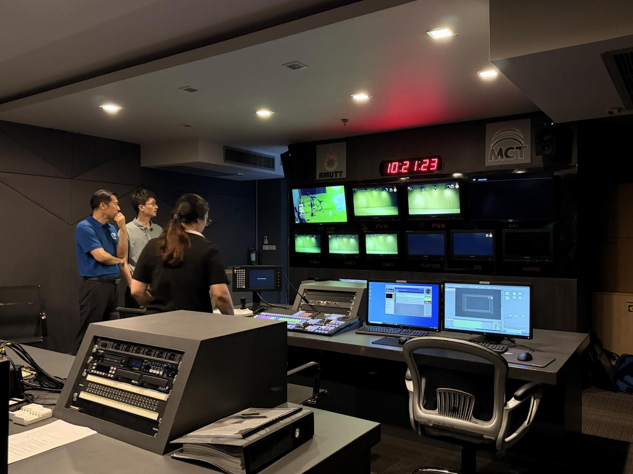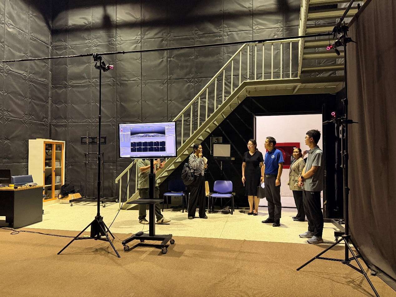 在RMUTT大众传播技术学院副院长及专业负责人的陪同下,代表团实地参观了学院多个核心教学与实践场所。泰方详细展示了包括专业录音棚、7.1声道混音工作室、影视摄像实验室、多媒体编辑中心在内的全流程教学设施。实验室内配备的先进设备,如专业摄像机、调音台、灯光系统及虚拟制作技术,展现了学院强调“理论与实践深度融合”的教学理念。泰方在实践教学上的投入与体系化建设令人印象深刻。尤其是在视听内容制作、数字媒体技术创新方面的实验室配置,与威尼斯官网大数据与人工智能学院在智能媒体、游戏建模等方向的发展规划高度契合。双方在课程衔接、实践项目联合开发上拥有广阔空间。