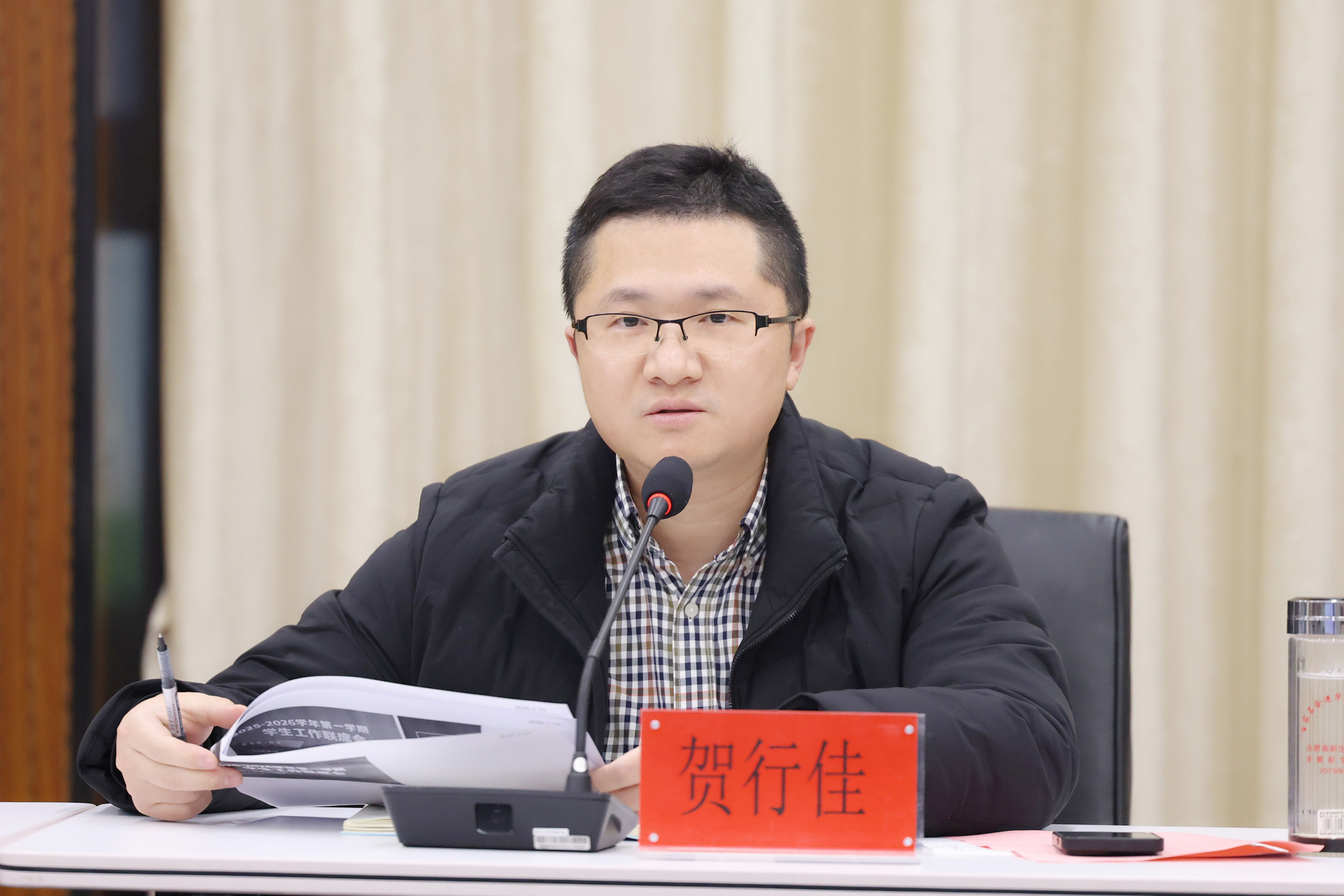 随后,副校长贺行佳对本学期学生工作与“学风建设月”取得的成效给予充分肯定。他指出,过去一年学校持续加强思想引领,拓展实践育人平台,学生竞赛成绩取得新突破,学生工作整体保持稳中向好、稳步推进的良好局面。对后续工作提出四点要求:一是全面复盘精准谋划,系统梳理2025年度工作成效,为2026年工作奠定扎实基础;二是筑牢假期安全防线,完善学生离返校闭环管理体系,实现假期安全管理全覆盖;三是学生培养多维赋能,健全学生组织与能力提升机制,有效增强学生综合素质;四是质效并重精准施策,聚焦考研升学、优质岗位、基层项目等重点方向,全力促进高质量就业。