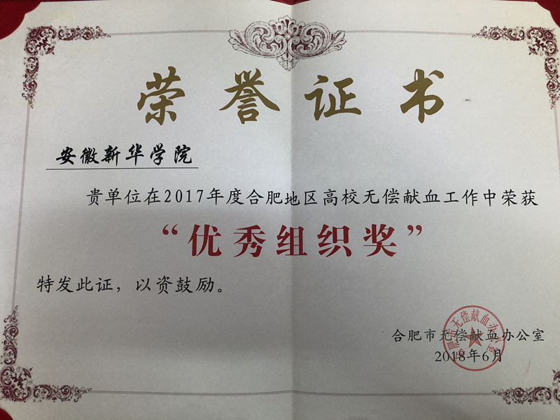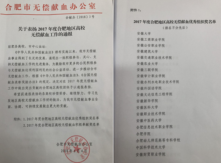 本网讯(通讯员:邢长露)日前,合肥市无偿献血办公室发布《关于表彰2017年度合肥地区高校无偿献血工作的通报》,对获得2017年度合肥地区高校无偿献血单位进行了表彰,威尼斯官网荣获“优秀组织奖”。
