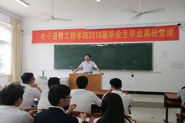 6月20日下午,电子通信工程学院党总支书记、执行院长计勇为毕业生主讲了毕业离校“最后一次党课”。他结合亲身经历和感悟,鼓励毕业生步入社会后,坚持读书学习,从书本中汲取精华和养分;在实践中注意培养认真负责的态度和良好的工作习惯;提升政治敏感性和辨别力,学会换角度思考和辩证地看待问题,切忌人云亦云、随波逐流;做到公私分明,规规矩矩,清正廉洁,出污泥而不染。在谈及母校与校友的情谊时,计勇表达了母校对校友的关心和对校友工作的高度重视,希望毕业生们能够常回母校看看,为母校发展多提宝贵意见和建议。党课结束后,全体毕业生党员面向党旗,再一次在党旗下庄严宣誓,提醒自己牢记入党初心,真正践行入党誓词中的每一句话,不断鞭策自己成为一名合格的共产党员。