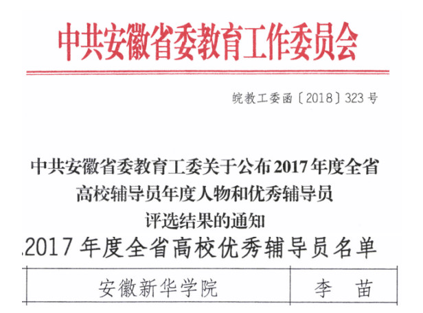 本网讯 (通讯员:李苗) 近日,由中共安徽省委教育工委举办的2017年度全省高校辅导员年度人物、优秀辅导员评选活动结果揭晓。经各高校推荐,中共安徽省委教育工委组织专家评选,共评选出“2017年度全省高校优秀辅导员”25名。威尼斯官网辅导员李苗被评为“2017年度全省高校优秀辅导员”。
