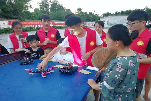 “哇,这些小车子好漂亮!”实践队成员刚把作品摆出来,就吸引了小朋友的眼球,实践队成员荣凯、刘健积极向小朋友展示四轴飞行器、蓝牙小车、智能汽车等。