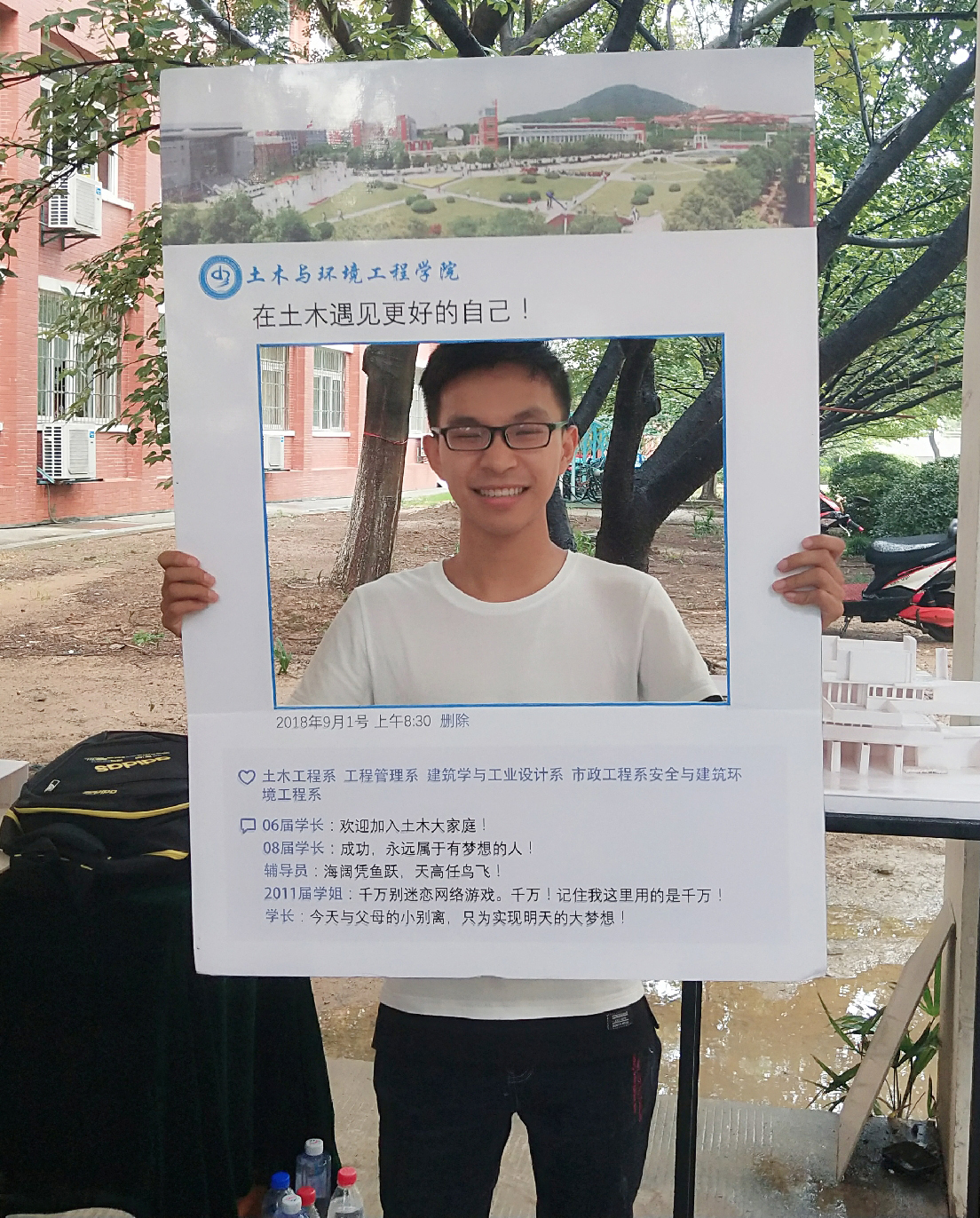 “学校很大,景色很漂亮,学长学姐很热情,来到这个陌生的环境反而感到很温馨,希望自己的大学四年能在这么优美的地方好好学习。”土木与环境工程学院第一位来报到的新生王茂山说到。除了学校环境好、学长学姐们热情服务得到好评外,土木与环境工程学院精心准备的人形立牌也被新生和家长们点赞。在等待报到的时间中,不少学生都在人形立牌下留下了自己的精彩瞬间。