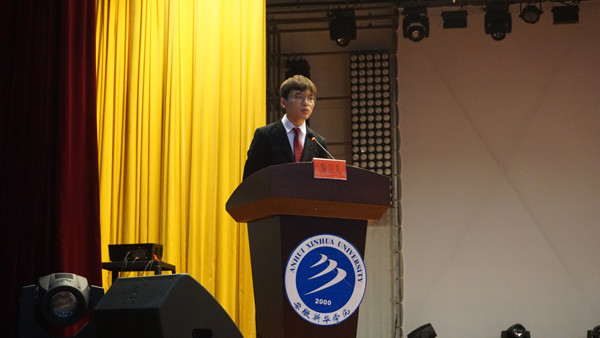 老生代表于康伟上台发言,他在讲话中分享了在华园所度过的两年的学习经历。他说道:“我非常珍惜课堂上的分分秒秒,老师的一字一句都不曾忘记。我记得英语老师待我们如自己人自己亲人一样的潇洒,我记得C++课上同学们一起讨论的欢声笑语。那一幕幕的场景就像一张张绚烂的剪贴画,串成一部电影,播放我们的快乐与忧伤”。“生活如此多娇,引无数大学生累坏了腰,闲坏了脑,我相信过完了大一您就会了解这句话”。