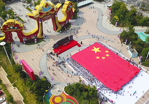 在全国劳模李祥斌、全国道德模范周传金、亚运会亚军兰明豪的领唱下,现场近万人齐唱《歌唱祖国》。嘹亮的歌声中,安徽警官学院国旗班的80名学生以及企业代表托举着长36米,宽24米的巨幅国旗走向方阵,以这种特殊的方式表达对祖国的热爱,向国旗敬礼。学生们的脸上洋溢着真挚的笑容,纷纷挥舞着手中的国旗为祖国献上自己的祝福。