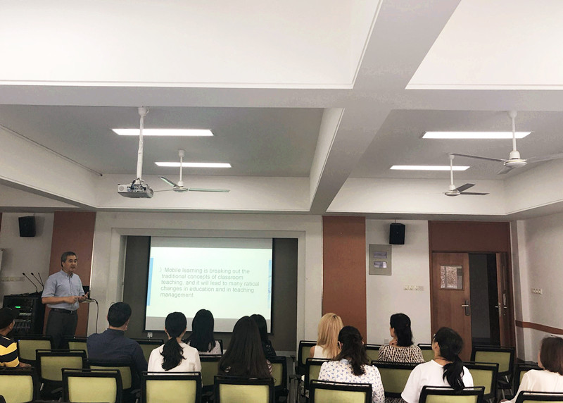 学术报告主讲人国际教育学院院长范东生以“计算机辅助外语教学当前发展的两大特征”为题,介绍了当前外语教学领域运用现代信息网络技术的最新发展趋势。范东生表示,计算机辅助外语教学发展值得关注的两大特征为“移动学习”与“体验式学习”。他指出,移动学习作为一种新的学习平台和学习模式,正在突破传统的课堂教学理念和教学模式,带来一系列有关教育理念、教学方法和教学管理方面的改变。他强调,国际教育学院的中外教师们都应密切关注新科技在外语学习方面的应用,紧跟快速变革的教学理念与教学模式潮流,教师应利用那些可视、可听、可感的教学媒体努力为学生创造体验生活,通过经验去认知的环境,让学生自然产生一种去体验,去参与的冲动,从而全身心地投入学习过程,并积极接触语言、运用语言,在亲身体验过程中掌握语言。
