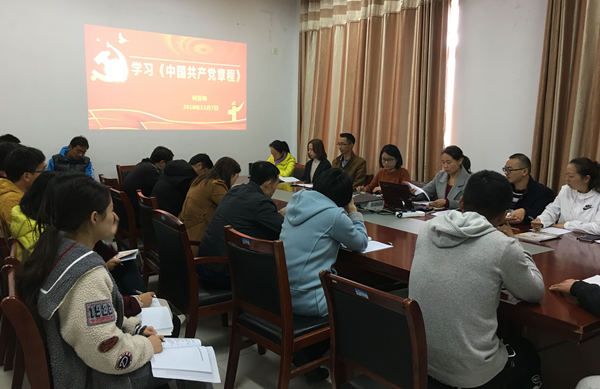 本次会议共有“书记上党课”“党建工作部署”两项议程。会议伊始,全体党员在何亚梅书记的带领下系统的学习了新修订的《中国共产党章程》。何亚梅首先介绍了《中国共产党章程》的学习重要性及其发展史,并带领大家共同学习章程总纲和基本条文。学习中,何亚梅重点解读了章程中新修改的条文,并突出了十九大章程修改的主要特点和主要原则。何亚梅指出,党章是所有共产党员工作、生活的行动纲领,每个共产党员要切实加强党章的学习,并对学习章程提出“三个要”:一是党章要学要精益求精的学;二是党章要用,要求政务实的用;三是党章要敬,要奉为圭臬的敬。党员们重温了《中国共产党章程》,详细了解了章程新修订内容。
