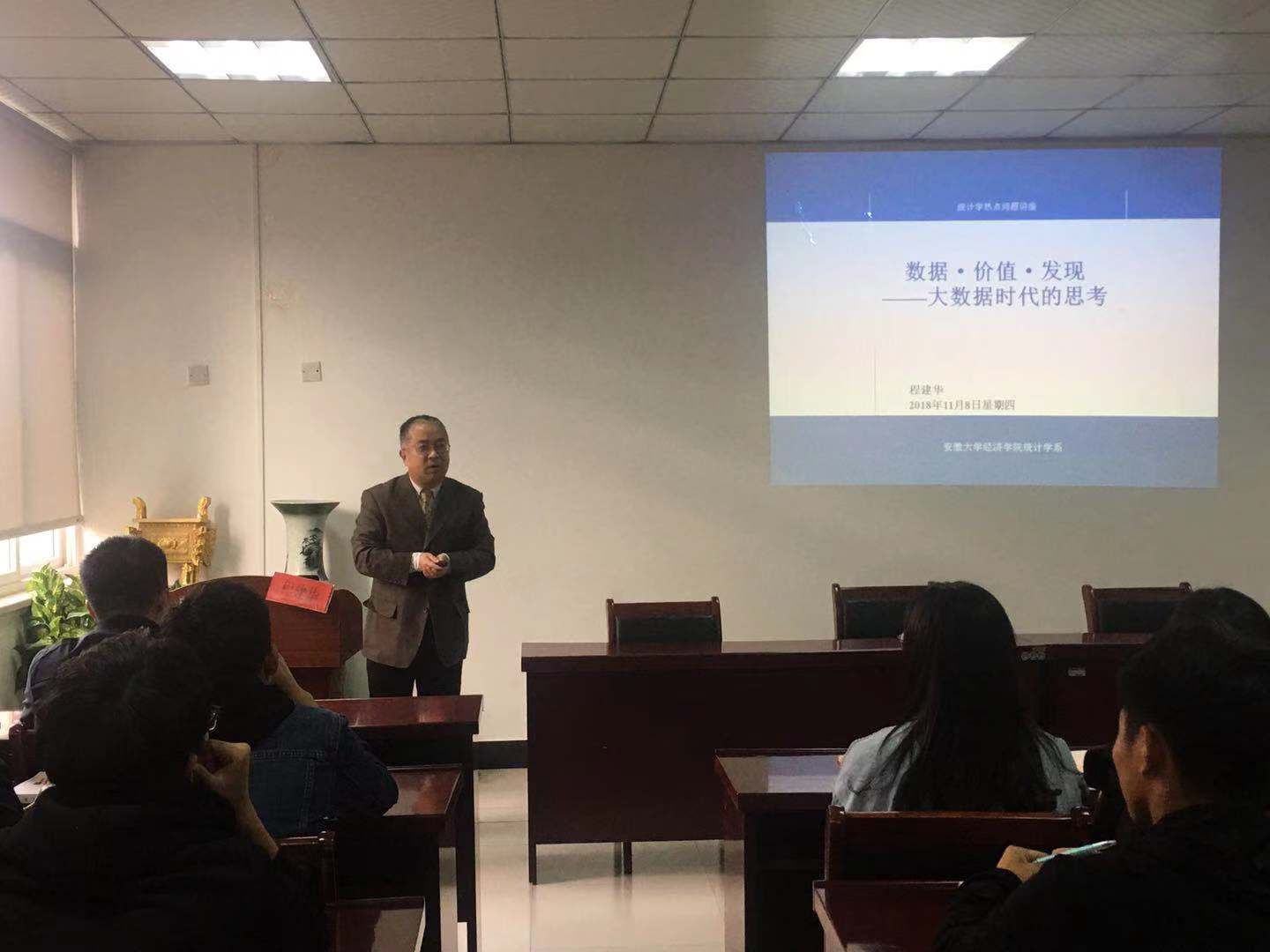 聘任仪式之后,程建华作题为 “数据·价值·发现——大数据时代的思考”的讲座。程建华教授在讲座中谈到,虽然已经进入大数据时代,但目前社会上对大数据的炒作有点过热,对大数据的认识还存在一定的误区。随后,程建华教授以“数据·价值·发现”为题介绍了数据、大数据的概念,数据的价值以及对数据价值的探索,并以2008年“三鹿奶粉”事件、Alpha狗、机器翻译等现实生活中的典型案例详尽讲解了大数据技术对当今生活、研究等领域的影响。程教授通过分享对大数据独到的见解,鼓励大家要以独立思考的精神去学习新知识、接受新知识。