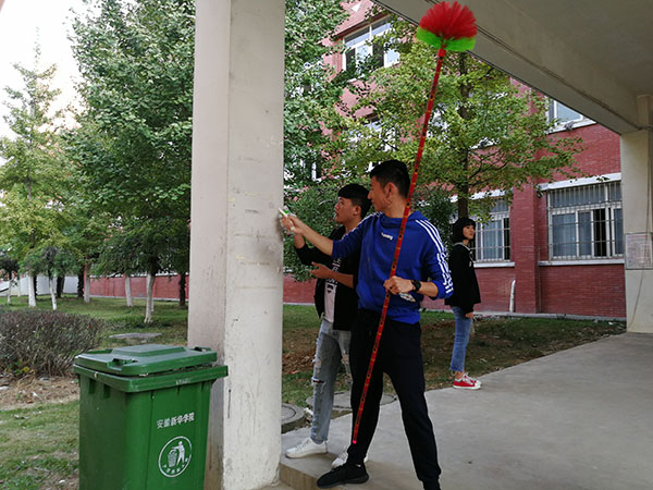 在校图书馆门前集合完毕后,学员们便开展文明养成系列活动之校园环境大清扫。他们按分配任务在责任区域内开展卫生清理及杂草拔除活动,重点对教学楼、公共设施(外墙、宣传栏、路灯杆、休闲椅)、草坪绿篱等地点进行清扫,同学们相互配合,积极清理垃圾。