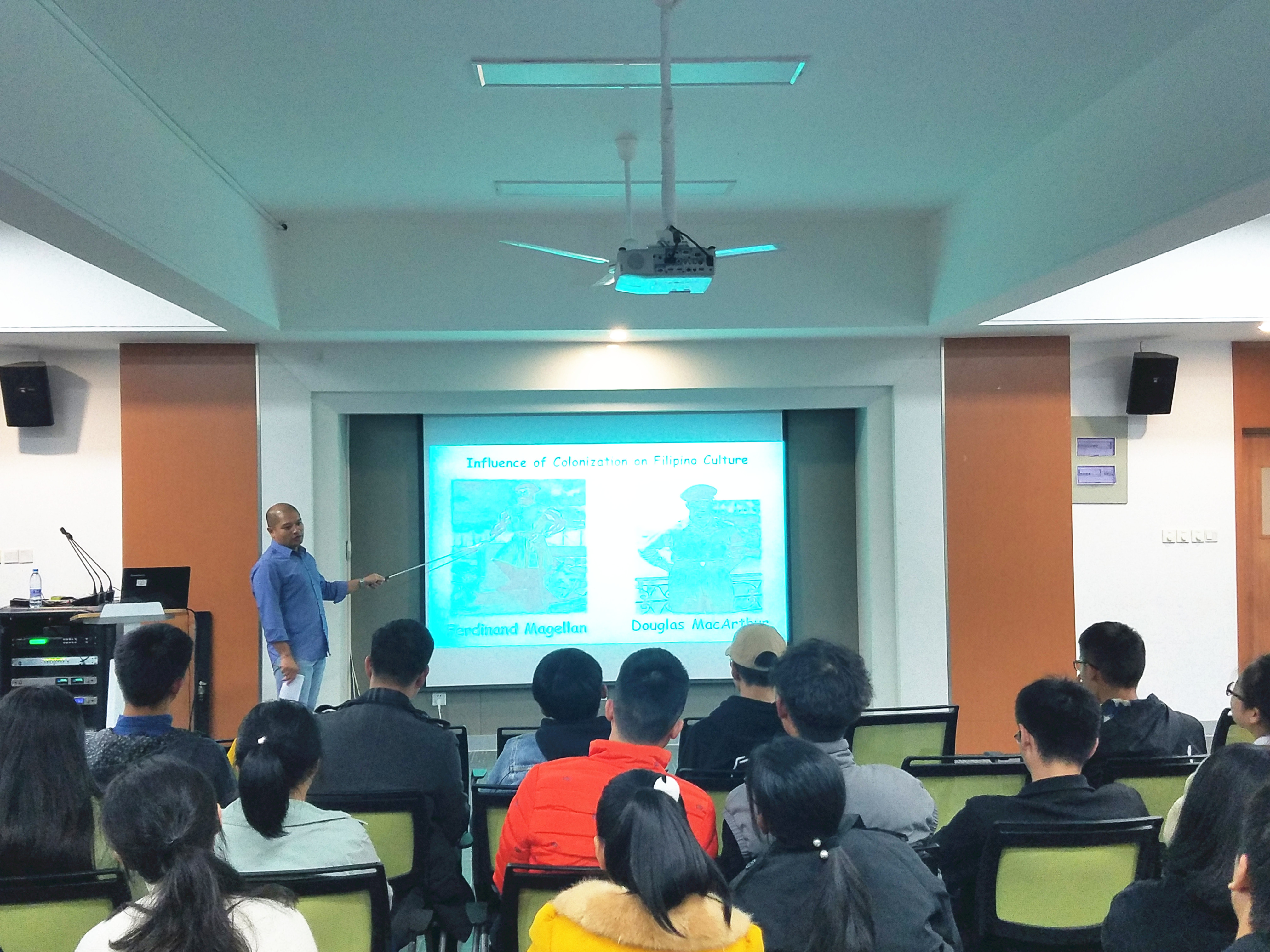 Eligah在中国任教十二年,游览过很多国家和地区。讲座上,他用一幅菲律宾地图将大家带入了菲律宾独特的殖民文化历史中。他介绍了殖民对菲律宾文化和宗教信仰的影响,向大家展示了菲律宾的独特的传统食物和壮观的名胜古迹,他用自己的阅历向大家讲述了自己对菲律宾的殖民文化的看法