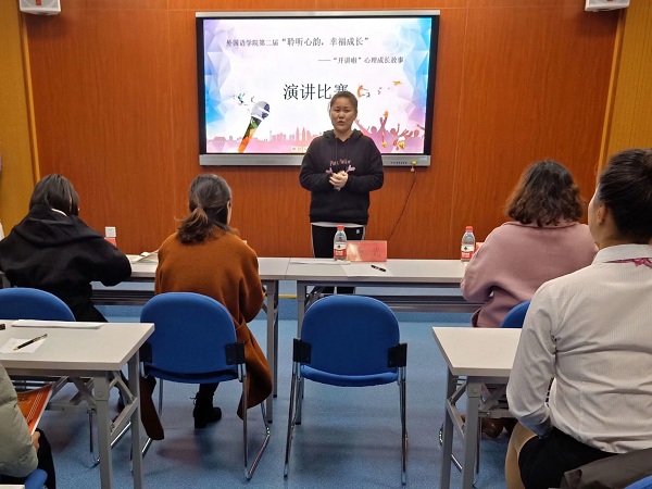 本网讯(通讯员:万媛媛)为了引导大学生培养自尊自信、理性平和、积极向上的社会心态,传递思想好声音,传播心灵正能量,促进大学生健康成长和全面发展,外国语学院于11月20日举办“聆听心韵,幸福成长”主题心理成长故事演讲比赛。外国语学院行政副院长杨光、相关教师代表以及部分学生代表参与此次比赛。
