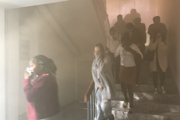 3时10分,教学楼冒起滚滚浓烟,随着消防警报的响起,老师们迅速停下授课内容,各楼层指挥人员迅速到位,沉着冷静的指挥学生们逃生。学生们用衣袖捂住鼻、口,尽量身体放低快速有序的逃离现场,疏散到安全的区域。从警报响起到集结完毕仅用时两分钟,疏散过程没有发生拥挤、踩踏事件,学生们成功疏散到安全位置,此次消防演练取得了圆满成功。