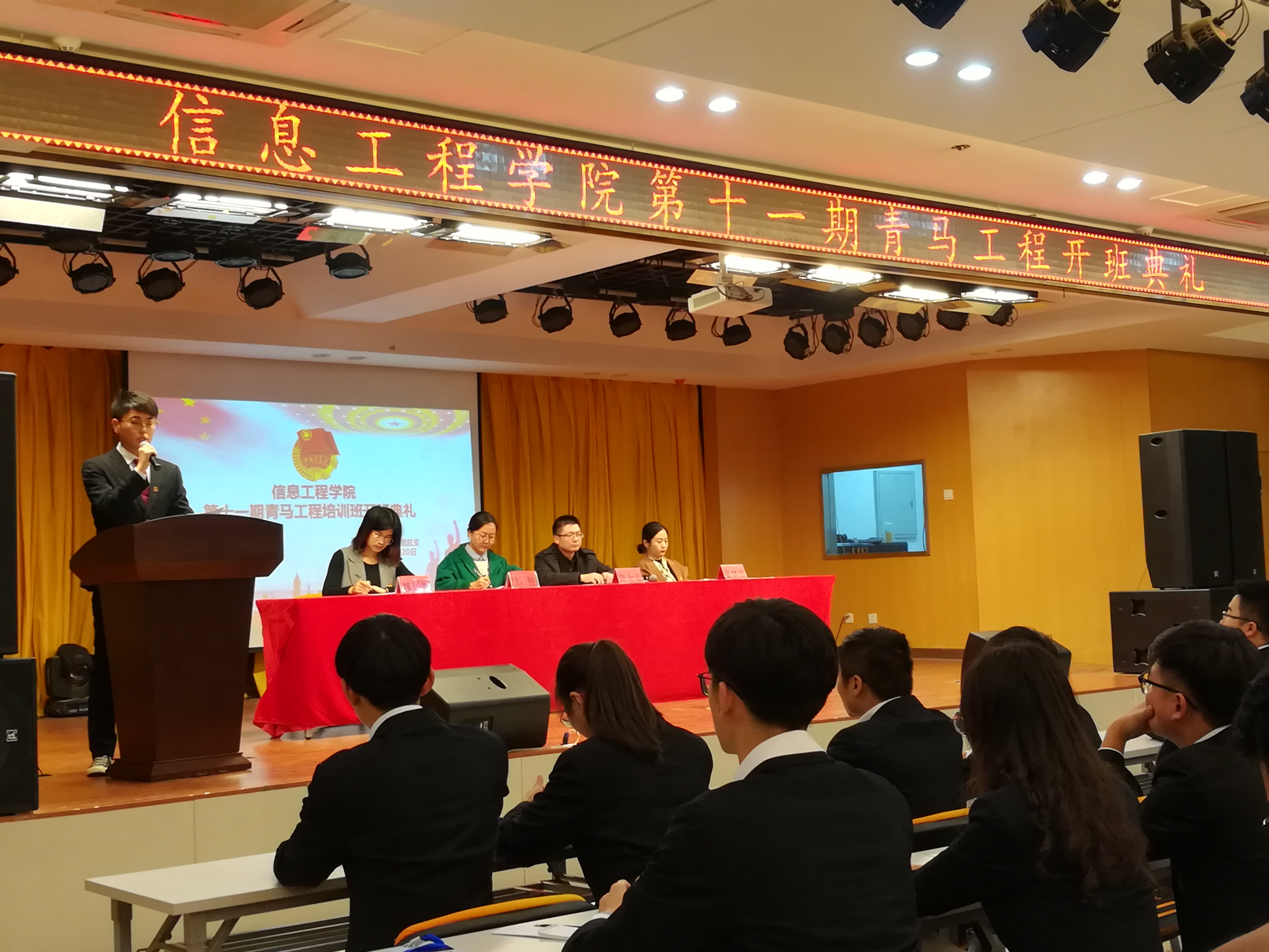 本网讯(通讯员:彭智)为进一步做好大学生骨干教育培养工作,11月20日晚,信息工程学院在小礼堂举办第十一期“青马工程”培训开班典礼。信息工程学院院长助理俞士毛、学院学管兼团总支书记、团总支副书记、新闻中心指导教师以及第十一期青马工程全体学员共同参加了此次开班典礼。