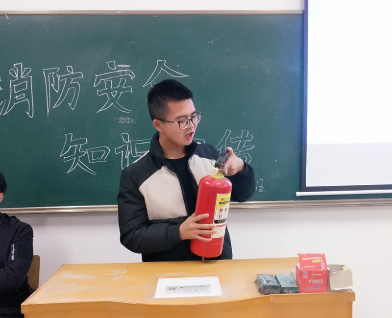此外,班级安全委员在消防安全主题班会上,向班级同学介绍了寝室常见消防安全隐患、初期火灾应对方法、应急逃生方式、常见的消防设施使用方法等,并现场演示了灭火器的使用方法。