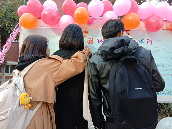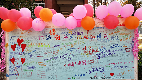 活动开始之前,助理团工作人员在教学楼前设立了多个展板,吸引了学生的驻足与观望。随后,活动负责人向大家解释了活动的规则与意义,鼓励大家积极参与。不同颜色、不同字体的话语渐渐写满了展板,有“学姐学长的帮助让初进大学校园的他们感受到了温暖”,也有“室友的细心关怀让第一次离开家人的他们感受到了温暖”,其中不乏有一些诙谐的语句。