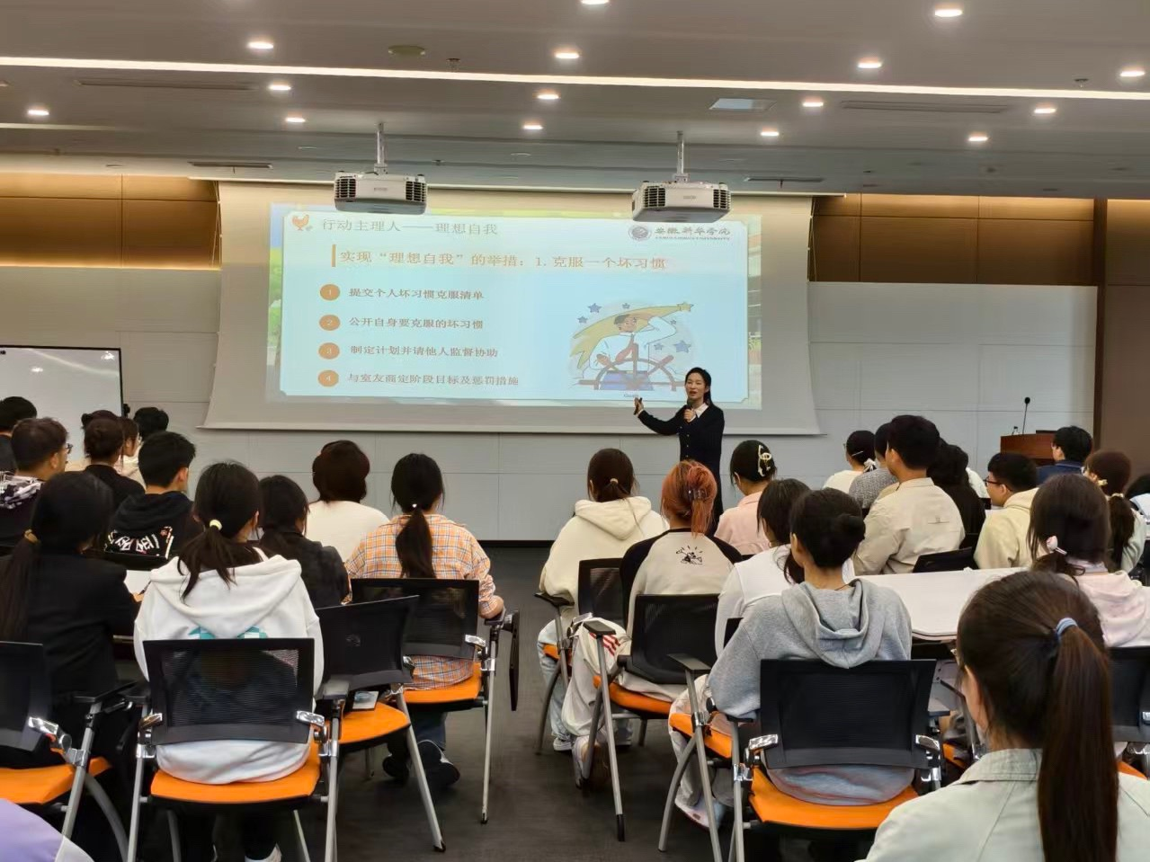 外国语学院樊远凤老师则以“核心价值观构建”为主题,通过精心设计的互动环节,引导学生深入探讨理想班集体的内涵。在分组讨论环节,同学们踊跃发言,提出了“勤学”“互助”“服务”“奉献”等一系列具有代表性的价值词汇。经过民主表决,最终确立了班级共同遵循的核心价值观。在此基础上,樊老师引导学生围绕寝室、教室、校园、网络四个生活场景,共同制定了切实可行的“四大公约”,不仅进一步明确了学生行为底线,还建立了相应的监督机制,有效强化了学生的规则意识和集体责任感。