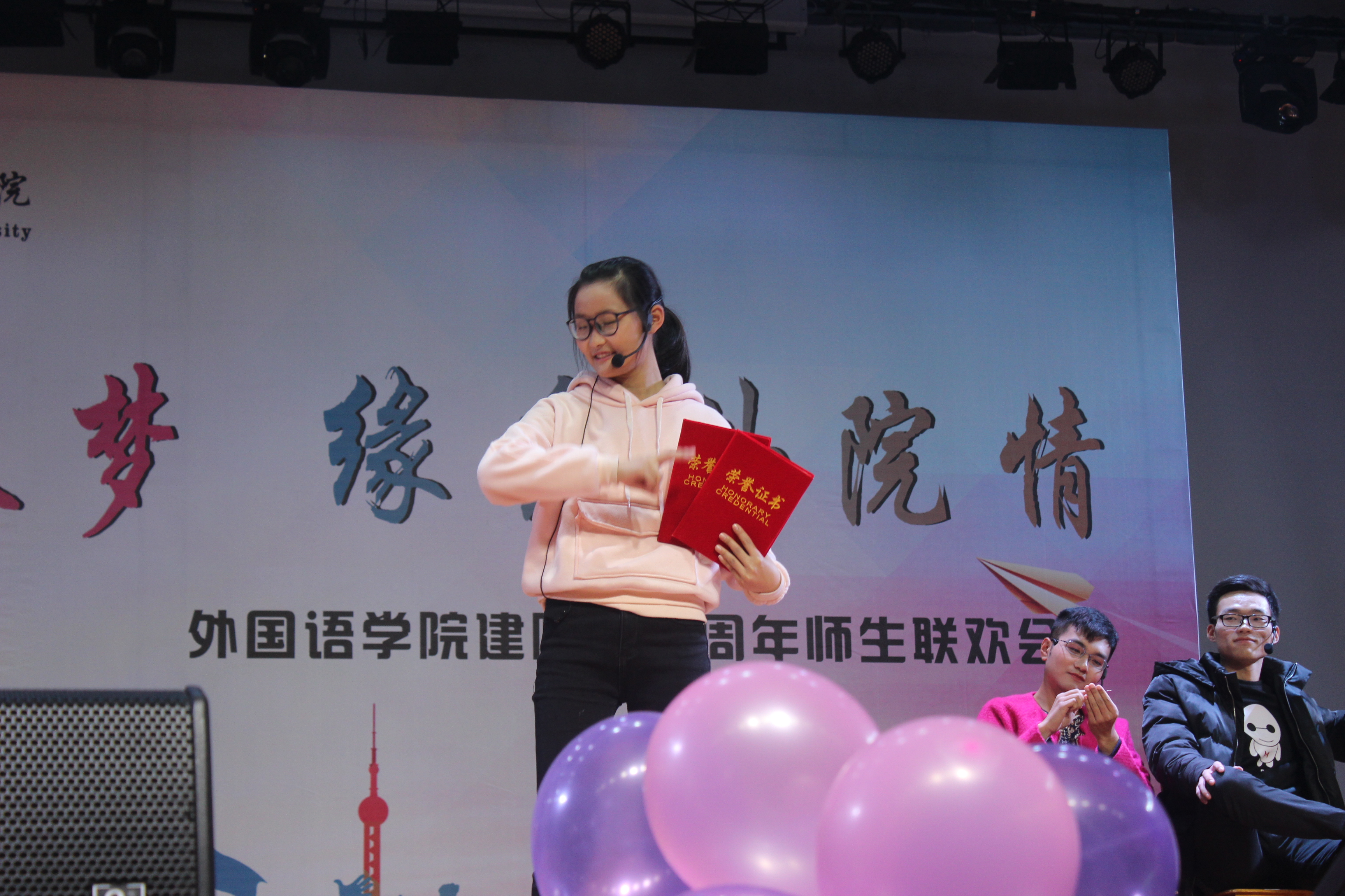 本网讯 (通讯员:万媛媛,摄影:徐叶琴)为庆祝建院11周年,12月5日晚,外国语学院 “放飞青春梦,缘系外院情”11周年暨师生联欢会在校大礼堂举办。外国语学院执行院长邵玲,药学院副院长余立新,科技学院副院长李洁,外国语学院院长助理杨艳霞、周景及外国语学院全体师生、校友代表观看了晚会。
