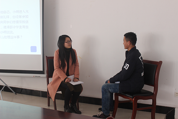 此次比赛分为班情熟知、主题演讲、谈心谈话、案例分析4个环节,每位参赛辅导员根据赛前抽签的顺序依次完成以上环节。首先是班情熟知环节,各位参赛选手对学生的基本信息了然于心、对答如流;随后的主题演讲环节中,参赛辅导员根据演讲题目,结合日常的学生管理工作及社会主义核心价值观念展开精彩的演讲;谈心谈话环节中,由现场学生扮演“问题学生”,就目前大学生日常生活和学习存在的普遍问题给各位辅导员出“难题”,现场情景模拟真实生动、声情并茂。在与学生几轮谈心谈话后,参赛选手凭借丰富工作经验和对学生一片真诚最终成功的劝服了各位“问题学生”。最后是案例分析环节,参赛选手围绕问题本质、解决思路、实施办法及相关启示进行阐述。