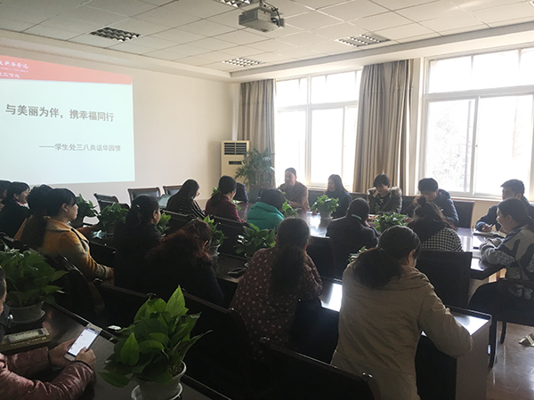 学生处团委召开了“与幸福相伴,携美丽同行”为主题的“三八”节座谈会,学生处团委全体教职工、宿管中心全体人员参加了本次活动,大家畅所欲言,表达了自己对学校、部门的热爱。