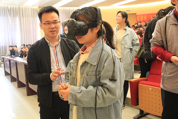 报告结束后,部分师生在工作人员的指导下,佩带VR设备亲身体验了虚拟现实感受。
