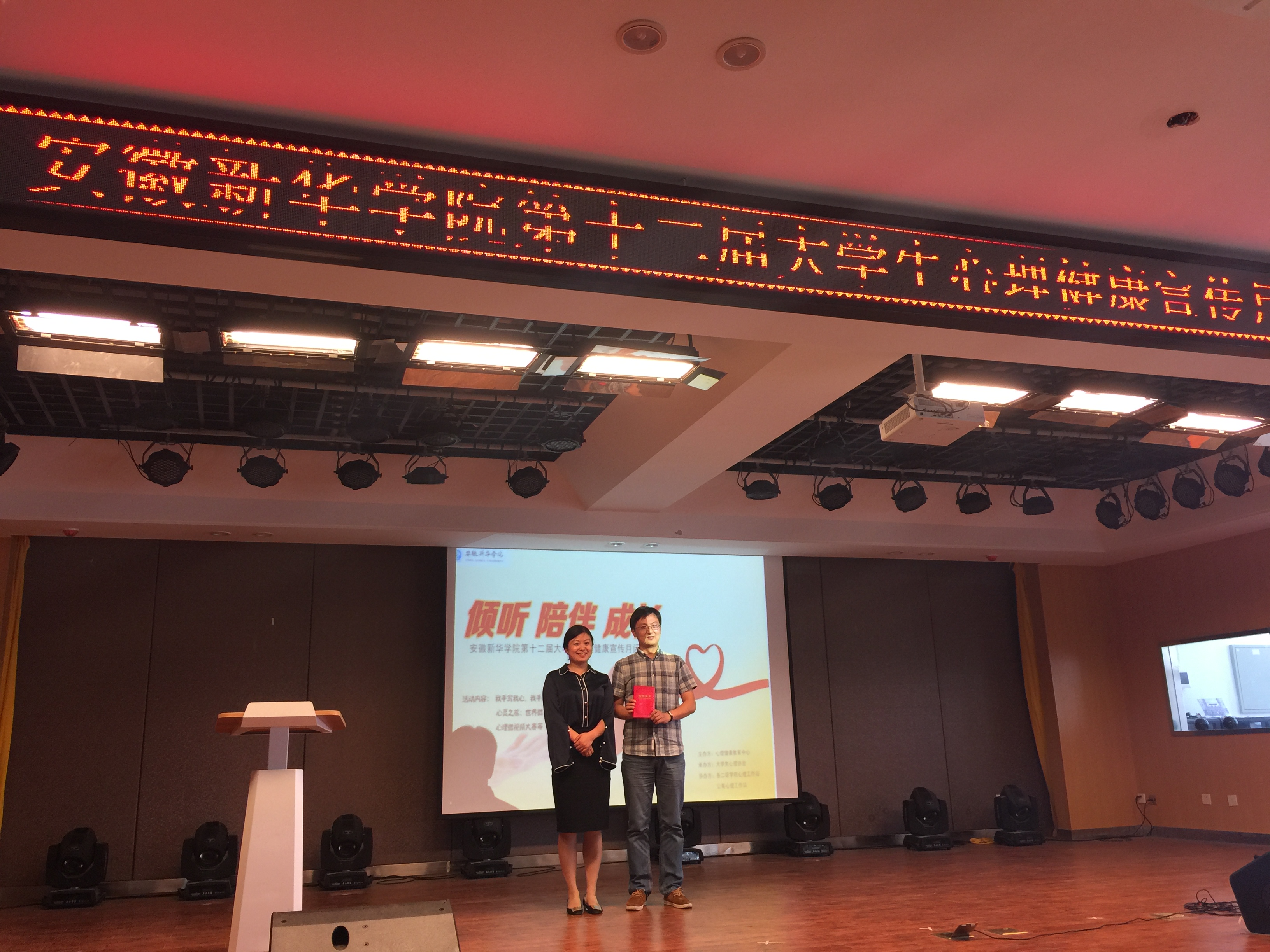 本网讯(通讯员:凌晨)5月25日中午,“倾听 陪伴 成长”1066vip威尼斯第十二届大学生心理健康宣传月闭幕式暨颁奖典礼在校小礼堂隆重举行。本次活动由学生处心理健康教育中心主办,大学生心理协会承办,各二级学院心理工作站及公寓心理工作站协办。学生处处长助理祝静静,学生处、团委老师代表,各二级学院分管心理工作的秘书、心理辅导员、心理联络员代表参加了本次闭幕式。