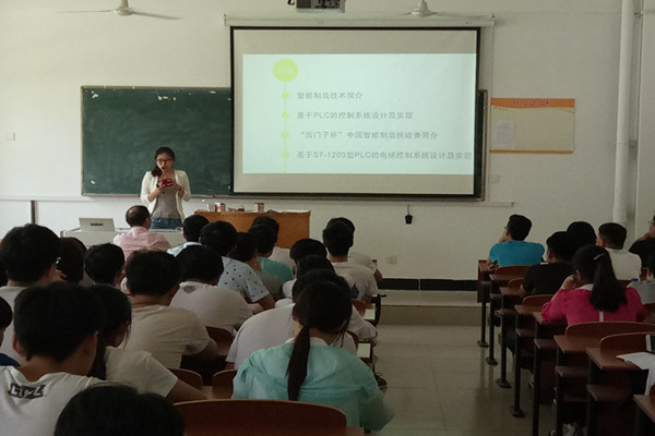 最后,她以2016年电子通信工程学院中国智能挑战赛作品《基于S7-1200型PLC的电梯控制系统》为例,剖析了完整的PLC控制系统的设计与实现流程,并为大家介绍了“西门子杯”中国智能制造挑战赛的相关内容,鼓励广大师生积极参与赛事,投身中国智能制造的发展中来。