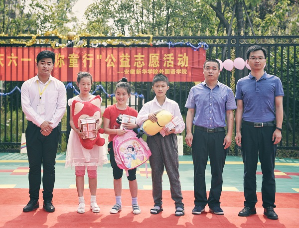 伴着歌声、欢笑声,汇演进入尾声,志愿者代表为留守儿童分发“六一”儿童节礼物,并合影留念。