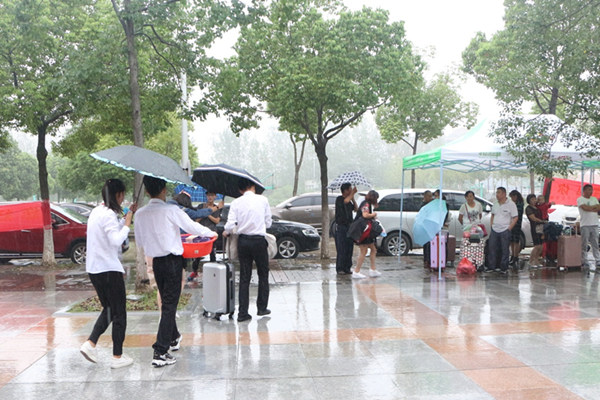 学院为新生提供一站式服务。尽管报到当天阴雨绵绵,但志愿者们不仅带领新生们走完报到流程,而且还将每一位新生都送到宿舍,待新生安置好后方才离开。志愿者们用笑容温暖新生,让他们感觉到虽然离家求学但并不孤单,志愿者们用行动帮助他们,让他们感觉到虽然陌生但并不害怕。