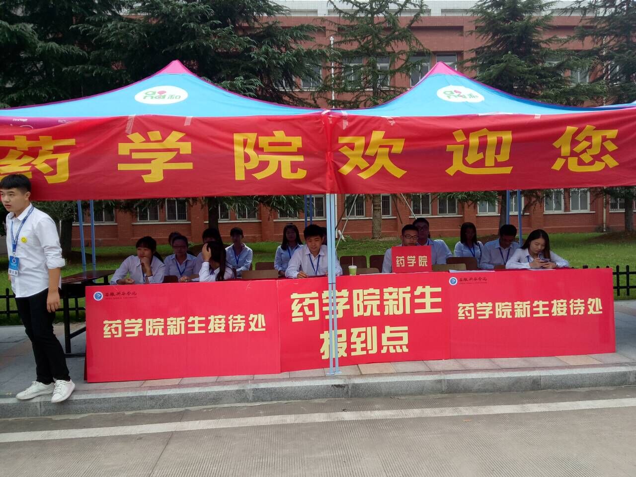 药学院全体师生负责迎新报道现场,专业老师负责专业咨询,各学生组织同学负责接待与引导。全体迎新人员高效的办事效率,亲切的待人态度,很快就建立了新生及其家长对药学院的认可与信赖。