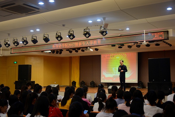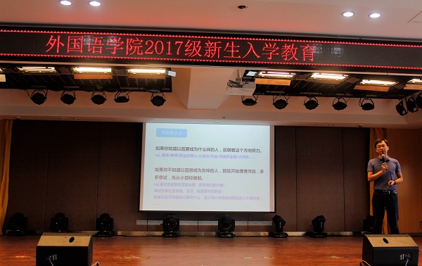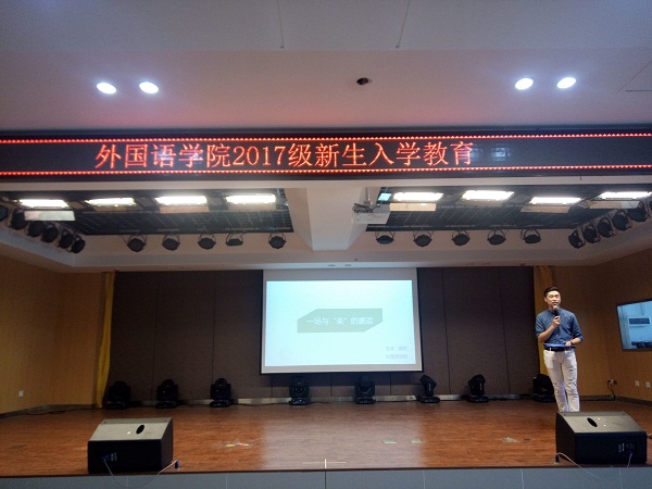 为帮助新生顺利适应大学生活,提高学生的综合素质。外国语学院行政副院长周景为2017级新生准备了以“如何读大学”为主题的专题讲座。首先,他通过自己的亲身经历向学生们绍了大学生应该如何正确读大学,如何合理对待大学生活以及如何制定自己的目标。幽默的互动多次迎来全场掌声,诙谐的语句带动现场的氛围,此次讲座为2017级新生点亮了大学时光的明灯。