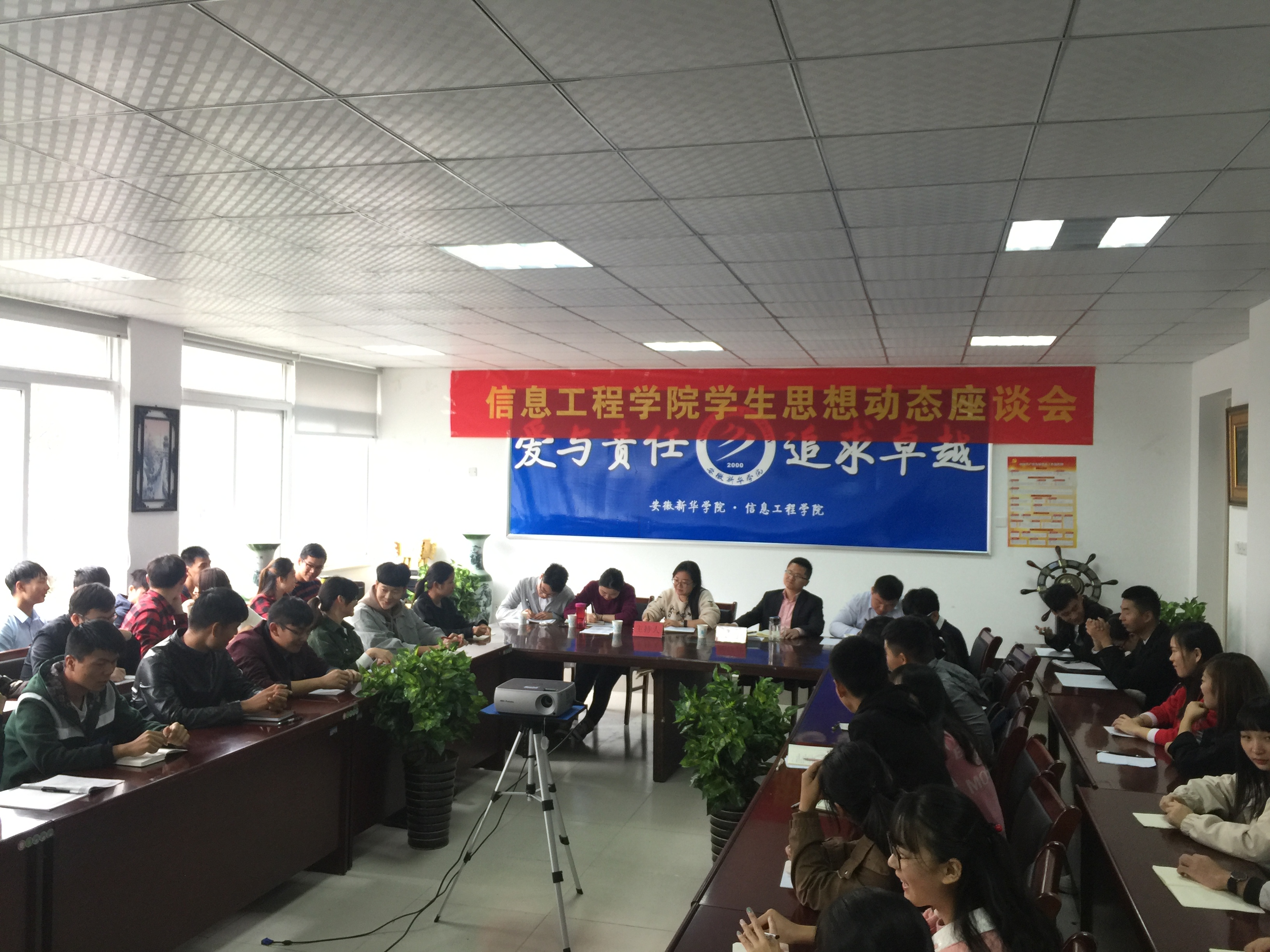 本网讯(通讯员:彭智)为进一步加强学风建设,强化班级管理,及时了解学生思想动态,10月13日中午,信息工程学院召开了学生思想动态座谈会,信息工程学院执行院长贺行佳及相关教师参会。