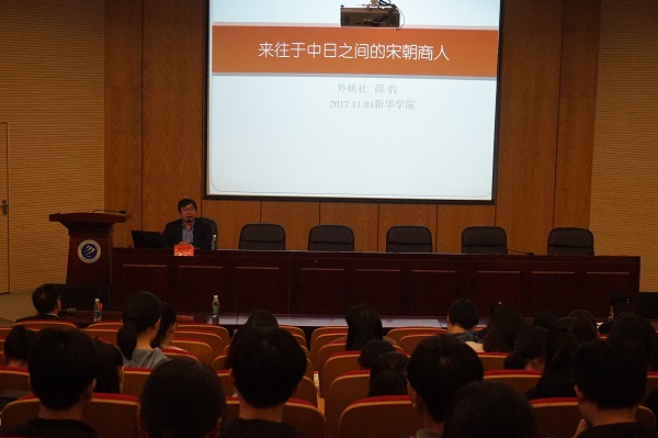 本网讯(通讯员:赵明)11月3日下午,外国语学院“亚洲共同体”系列学术讲座第十讲正式开讲。此次讲座邀请了外语教学与研究出版社综合语种分社编委会主任、中国国际贸易学会国际商务日语研究会常务理事、日中翻译文化教育协会常务理事薛豹教授为我外国语学院师生作题为“来往于中日之间的宋朝商人”日语学术讲座。讲座由外国语学院日语系主任宋志强主持,外国语学院日语系全体师生共计100余人出席并聆听。