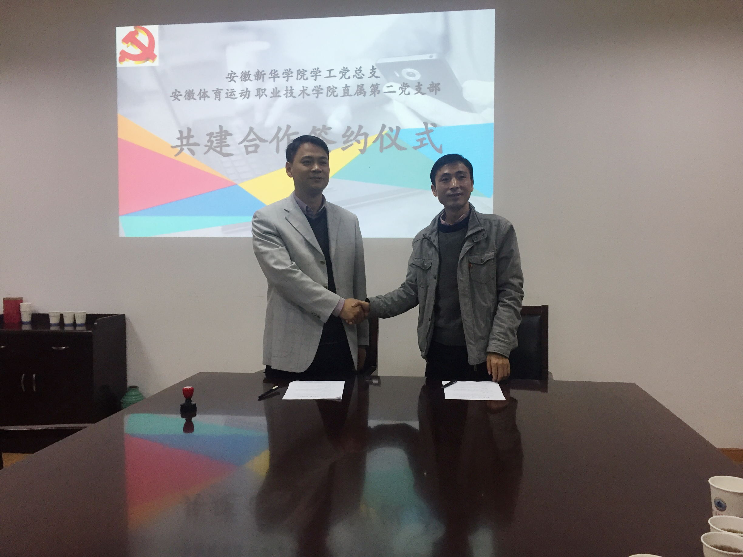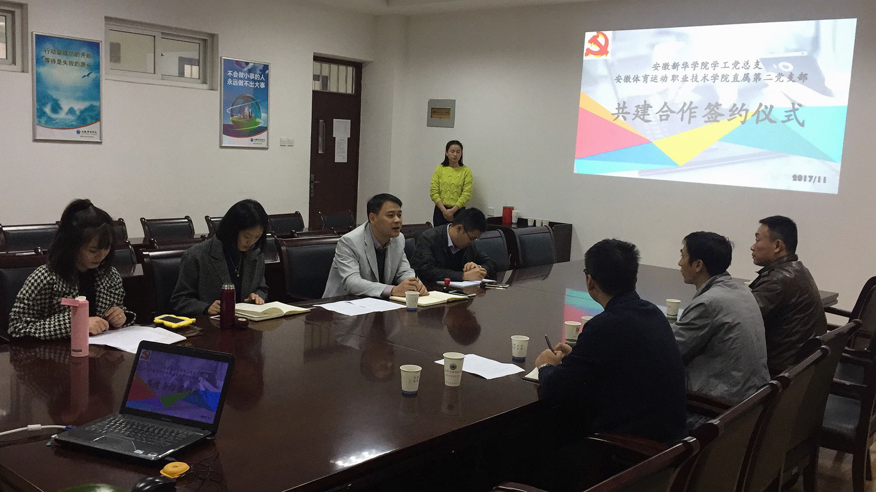 11月14日上午,安徽体育运动职业技术学院教科处处长李致富、培训中心副主任马春来、团委干事刘伟代表安徽体育运动职业技术学院直属第二党支部莅临本校,与学工党总支开展基层党组织结对共建签字仪式,学生处处长汪俊东代表学工党总支参加了签字仪式。