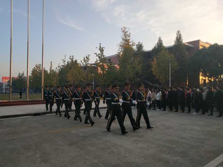 升旗仪式于上午7时开始,国旗班的护旗手们迎着朝阳将国旗送上升旗台,雄壮有力的《义勇军进行曲》响彻校园,在场的学生们纷纷行注目礼。迎风飘扬的五星红旗,既向征着祖国不断繁荣昌盛,也昭示着当代大学生的发展前景,蒸蒸日上。