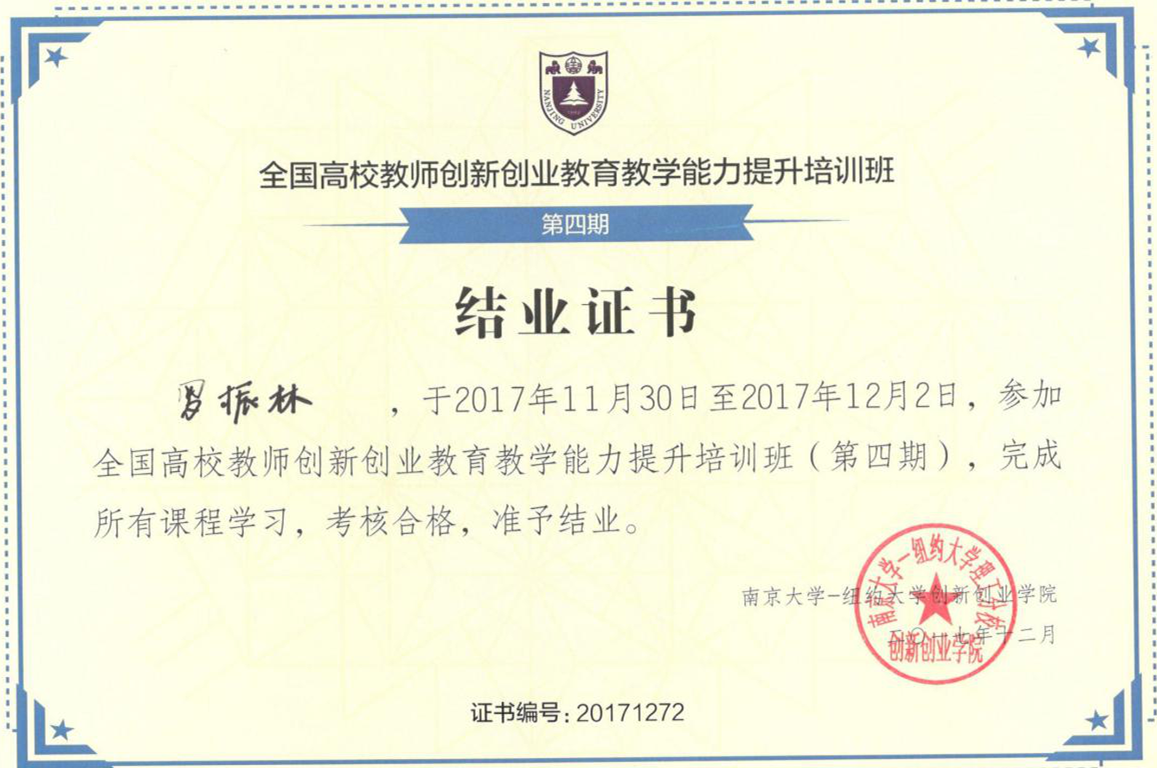 本网讯(通讯员:龚欣)11月30日至12月2日,全国高校教师创新创业教学能力提升培训班(第四期)在南京大学成功举办,来自全国各地20余所高校80余名创新创业教育教学管理人员、课程教师、创业导师等人员参加,威尼斯官网学生处教师代表罗振林参加培训,并获得结业证书。