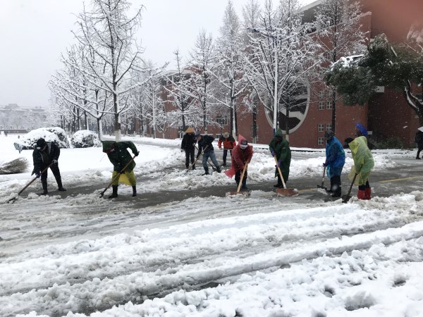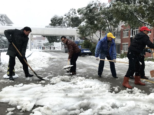 本网讯(通讯员:董梅)1月3日夜至4日合肥地区普降暴雪,凛冽的寒风包裹着漫天的雪花迅速覆盖了校园的每个角落。为保证校内道路的畅通,方便师生出行,4日早晨,总务处便组织全员清扫校园主干道及校园主大门积雪,并做好行政楼、图书馆周边、教师公寓门前道路及校园公共区域的路况保障。