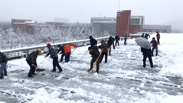 随着雪势的增大,为防止校大礼堂房顶、自行车棚、开水房屋顶积雪负载过重,总务处相关行管人员带领维修工们分区域冒着风雪连续奋战,目前大礼堂、开水房屋顶及自行车棚的积雪正在持续清除中。此次的暴雪导致校园路面积雪深达十几公分,由于雪水的踩溅使得通往室内的地砖台面尤其湿滑,为确保广大师生的行路安全,总务处临时在人流量大的路段设置禁行围栏并及时安排物业公司人员、食堂及开水房员工清理主通道入口积雪并在行人较集中的路段和出入口铺设防滑垫、放置防滑警示牌。