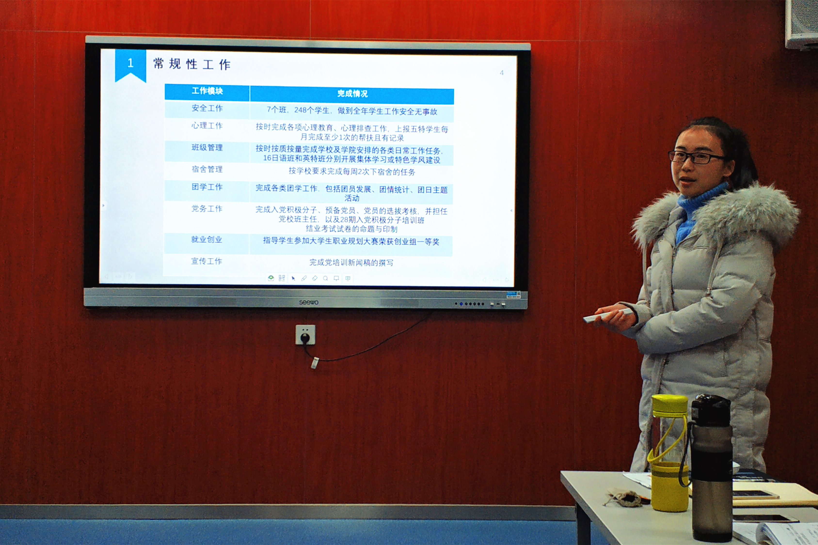最后,邵玲作总结发言。她指出,辅导员队伍要多学习、多交流,不断提升自己的理论水平,挖掘自己的潜力,每一位辅导员要有自己的特色和专长。她强调,2018年的学生管理工作要在党的十九大精神和习近平新时代中国特色社会主义思想的指导下,紧紧围绕学校“两个评估,一个建设”的目标开展,在原有工作的基础上不断创新,不断进取,力争在新的一年里取得更好的成绩。