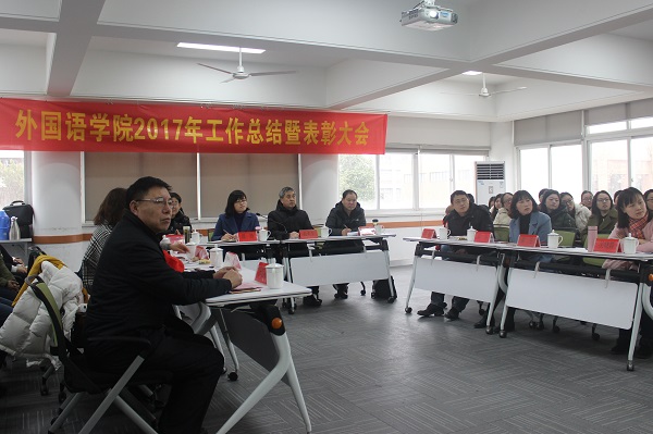 最后,邵玲作总结发言。她首先感谢范东生顾问和两位学科带头人的辛勤指导,感谢全体教职工的齐心协力,外国语学院2017年取得的成绩与进步是全体教师工智慧和汗水的结晶。她指出,2018年是学校顺利完成“121”工程的最关键的一年,全体教职工一定要“撸起袖子加油干”,按照学校的整体部署,齐心协力,攻克难关,勇于创新,锐意进取,为威尼斯官网地方应用型高水平大学建设和审核评估、专业评估做出更大的贡献。