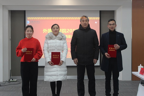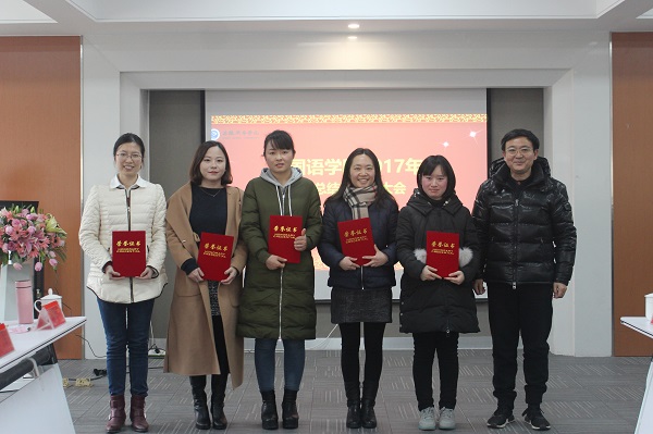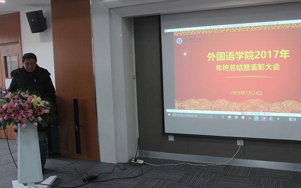 教授黄川、曹军、范东生分别为获奖教师颁奖。获得“科研标兵”荣誉称号的教师金怀梅代表获奖教职工发言,她首先回顾了自己在外国语学院的工作历程,并分享了自己在科研工作上的经验,表达了对外国语学院的感谢,并鼓励全体教职工认真工作,刻苦钻研,投入更多的时间和精力,在新的一年里取得更大的成绩。