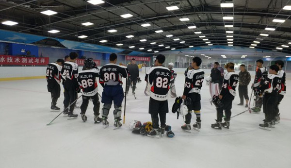 训练场上,在指导教师张爱臣的带领下,队员们认真听,虚心学,刻苦练,满怀信心,期望能够在本次全国冰球锦标赛中获得满意的成绩。